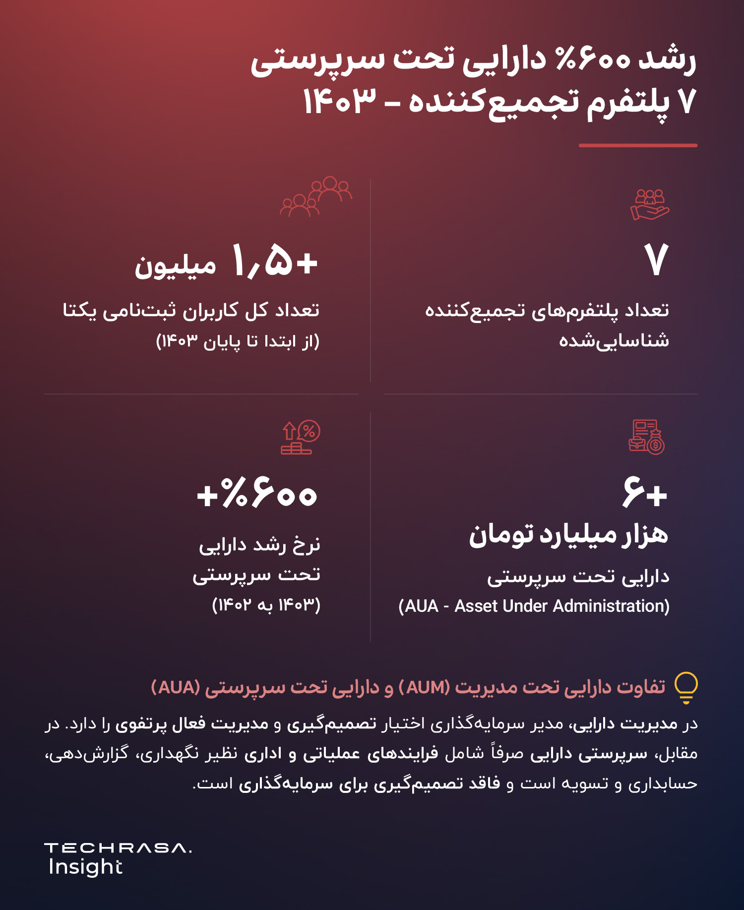 در مقابل، در ۷ پلتفرم تجمیع‌کننده شناسایی‌شده، بیش از ۶ هزار میلیارد تومان دارایی تحت سرپرستی قرار داشته است که نسبت به سال ۱۴۰۲ بیش از ۶۰۰٪ رشد داشته است.