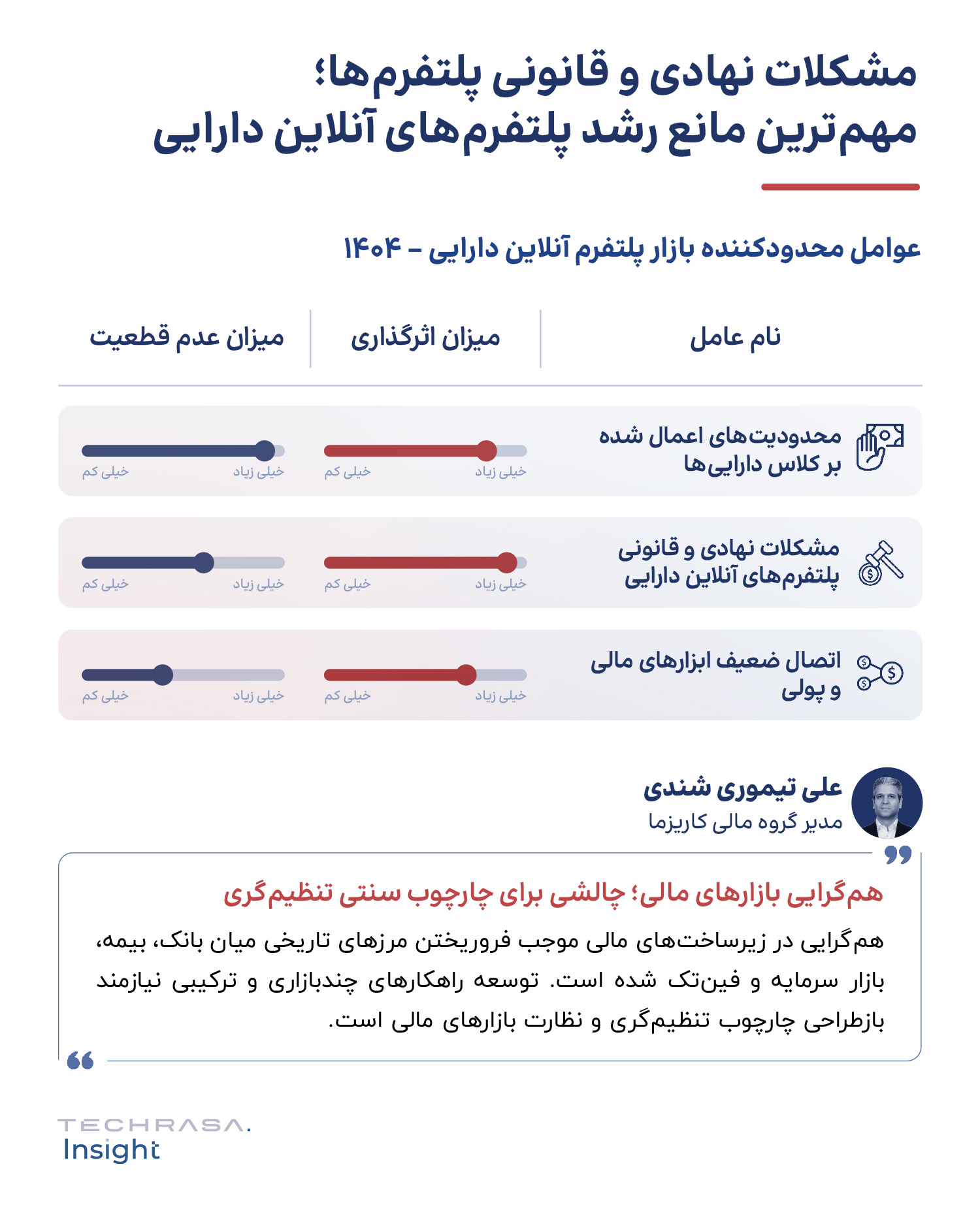 مشکلات نهادی و قانونی، مانند تعدد نهادهای ناظر، نظام کارمزد دستوری و ناپایداری و غیرقابل‌پیش‌بینی بودن تصمیم‌گیری‌های کلان، یکی از محدودکننده‌های اصلی است. همچنین، اتصال ضعیف سیستم‌های مالی و پولی کشور مانع از توسعه سریع‌تر پلتفرم‌های آنلاین دارایی شده است و این چالش‌ها سرعت رشد صنعت را کند کرده است.